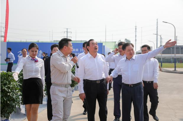 8日、プロジェクトの建設(shè)工事現(xiàn)場を視察する中國共産黨徐州市委員會と協(xié)鑫集団の主要責任者。(徐州=新華社配信)