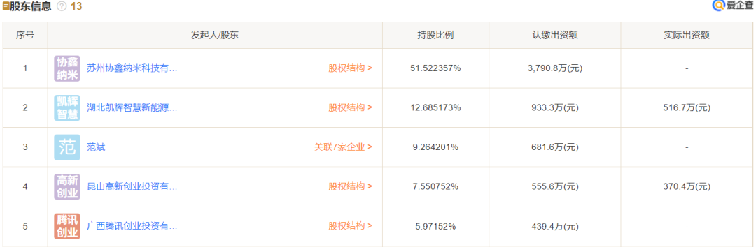 昆山協(xié)鑫光電材料有限公司成立于2019年12月,法定代表人為范斌,經(jīng)營(yíng)范圍包含光電材料科技領(lǐng)域內(nèi)的技術(shù)開(kāi)發(fā)、技術(shù)咨詢、技術(shù)服務(wù)、技術(shù)轉(zhuǎn)讓等。該公司由昆山高新創(chuàng)業(yè)投資有限公司、湖北凱輝智慧新能源基金合伙企業(yè)(有限合伙)等13位股東共同持股,持股比例未披露。